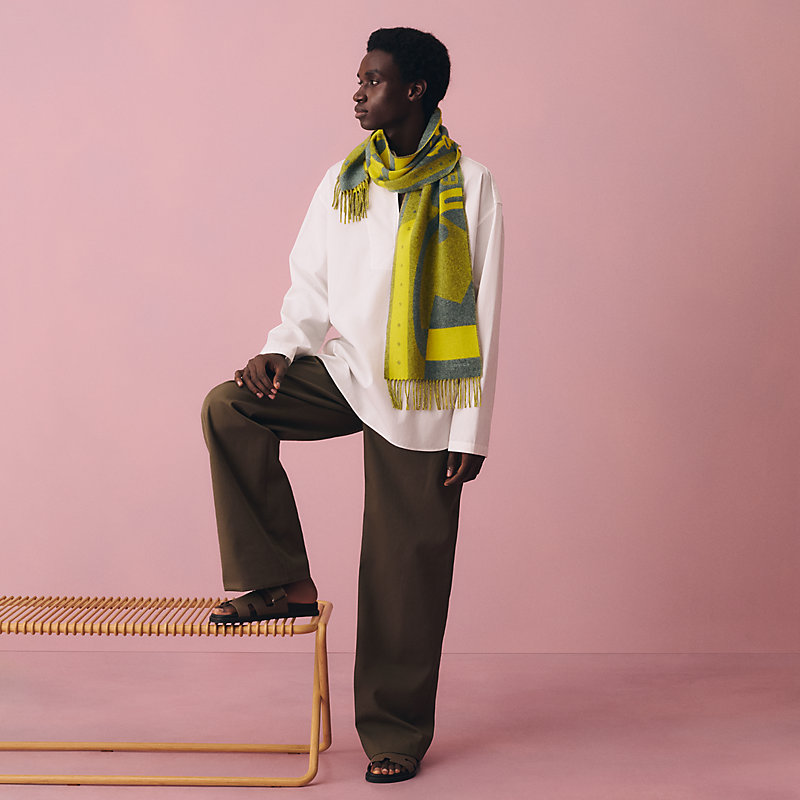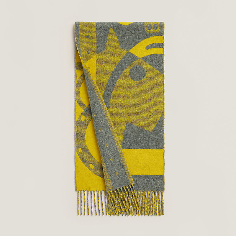 山羊绒围巾(100%山羊绒)。 这款双色山羊绒围巾采用提花编织工艺,由西里尔·戴肯(Cyrille Diatkine)设计的“预备,跑!”图案赋予其鲜明的几何视觉效果。