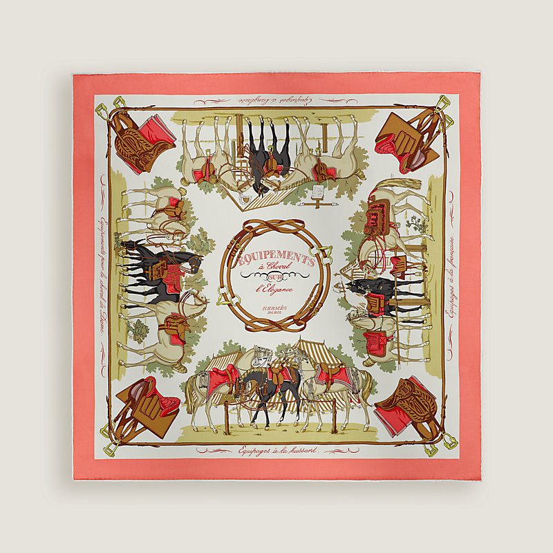 披戴华丽鞍辔的骏马在营帐前休憩,周围环绕着四副马鞍,彰显那个时代马具的优雅风采。每匹马的毛色、马毯和姿态各不相同,呈现一幅色彩缤纷、逼真写实而又活力盎然的错落画面,其中一匹马仿佛正在嗅闻一朵盛开的花,鼻孔隐没于花间。作为罗贝尔·杜马(Robert Dumas)的忠实合作伙伴,雨果·格里卡尔(Hugo Grygkar)设计了百余款丝巾图案,他们的马术灵感造就爱马仕的一系列隽永之作。