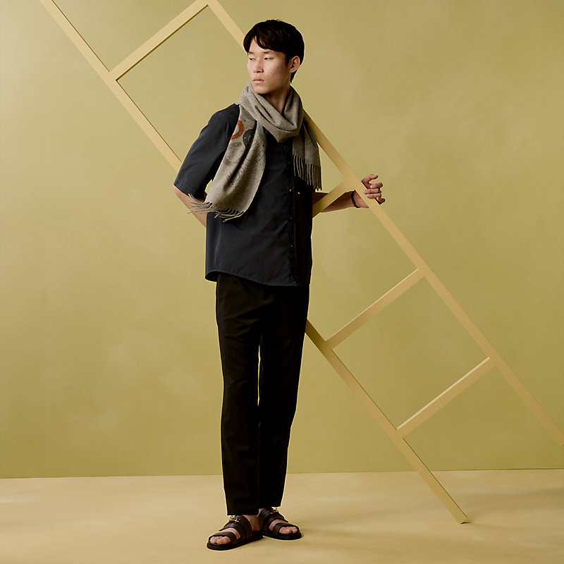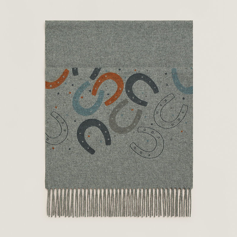 山羊绒围巾(100%山羊绒)。 这款柔软的山羊绒围巾运用丝网印刷工艺,生动呈现设计师路易·波肯(Louis Boquin)设计档案中的经典“马蹄铁匠(Maréchal Ferrant)”图案。