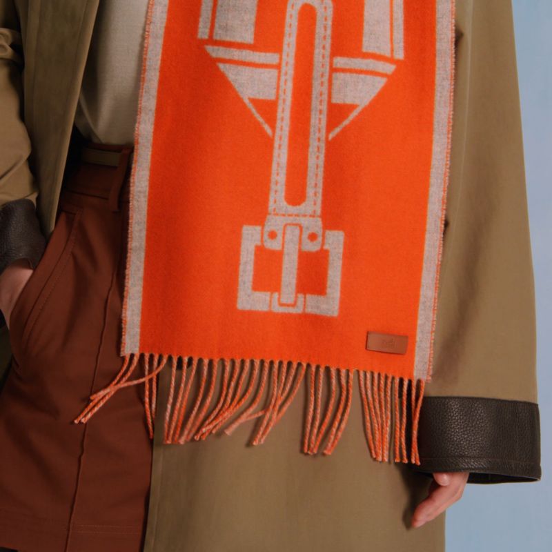 山羊绒围巾(100%山羊绒)。这款围巾色彩缤纷、图形生动,灵感源自赛马骑师的骑装。