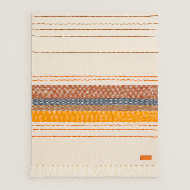 这款宽大的山羊绒长披肩采用尼泊尔传统有梭织机编织而成,饰有彩色条纹和鲜艳的压印羊羔皮标签。