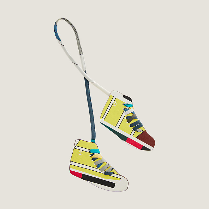 此配饰趣味盎然且令人心情愉悦,可用于装饰包袋肩带、行李箱或门把手,甚至可作为钥匙圈使用。品牌结合真丝和图案印花皮革鞋带,打造出一双色彩缤纷的运动鞋,让您以愉快的心情展开全新的一天!