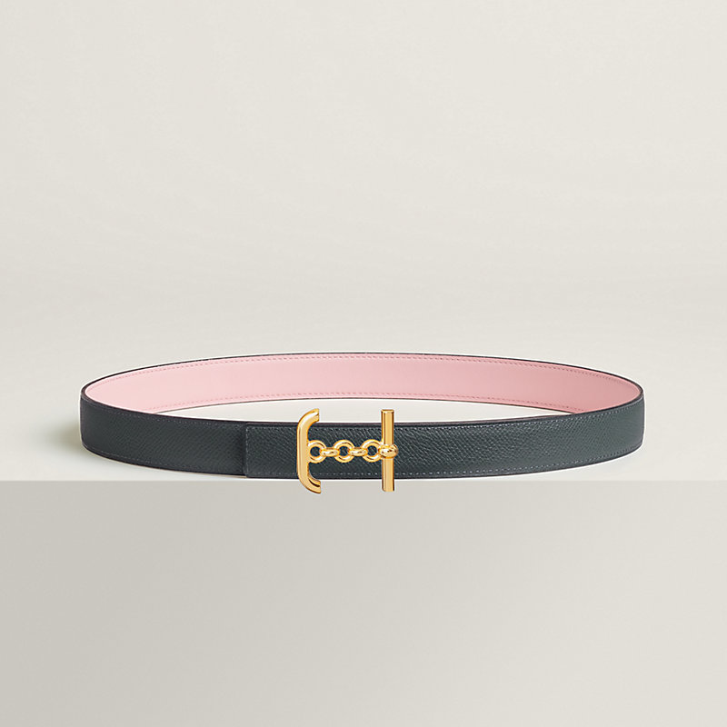 金属皮带扣。这款皮带扣的灵感源自爱马仕的航海世界,象征精致细腻的船锚。金属质感: 镀黄金 & Swift和Epsom小牛皮双面皮腰带。