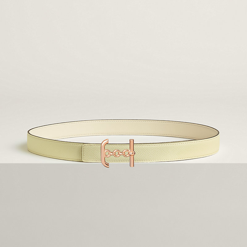 金属皮带扣。这款皮带扣的灵感源自爱马仕的航海世界,象征精致细腻的船锚。金属质感: 镀玫瑰金 & Swift和Epsom小牛皮双面皮腰带。