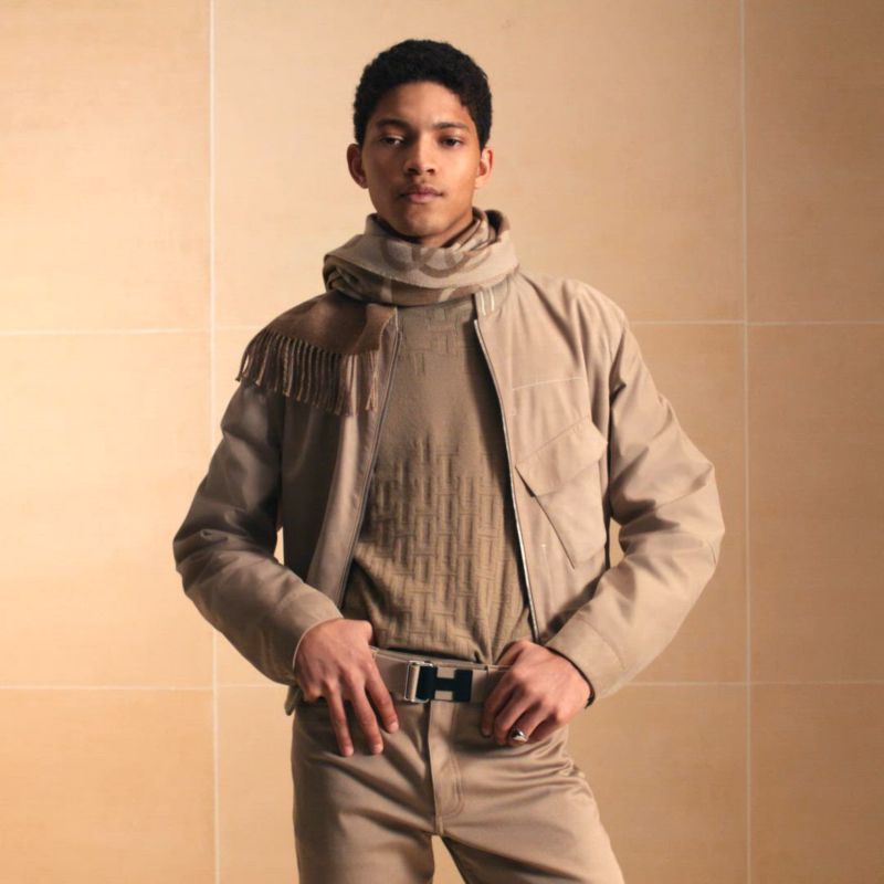这款双色山羊绒围巾饰有提花编织,交织的马衔为其增添几何风格。