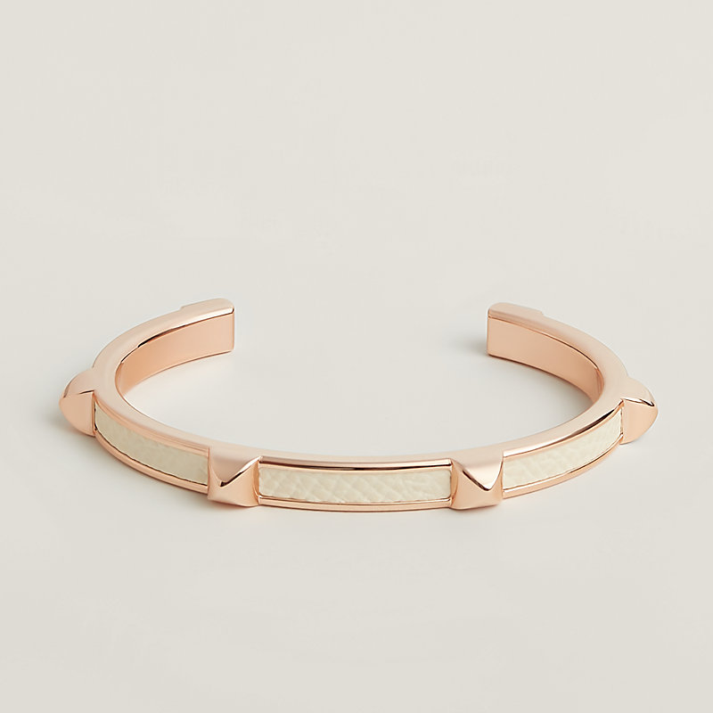 Epsom小牛皮和金属手镯。Athena系列致敬爱马仕经典Medor标志,在一系列金属与皮革珠宝上重新诠释饰钉元素。窄版手镯适合叠戴!