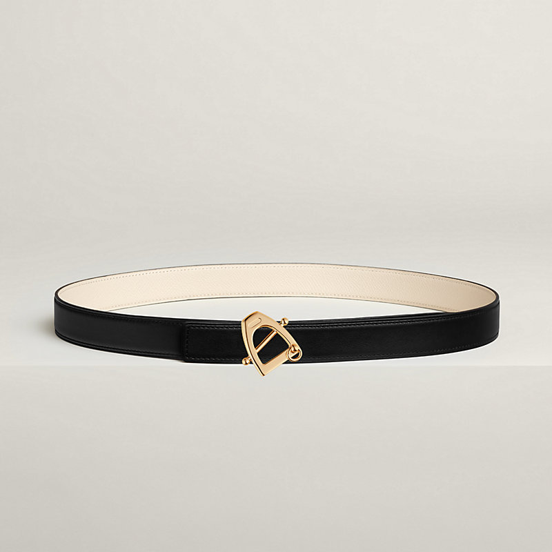 金属皮带扣。这款皮带扣以马镫造型演绎马术风格。侧面的活动圆环为这款皮带扣增添奇妙气息。 & Swift和Epsom小牛皮双面皮腰带。