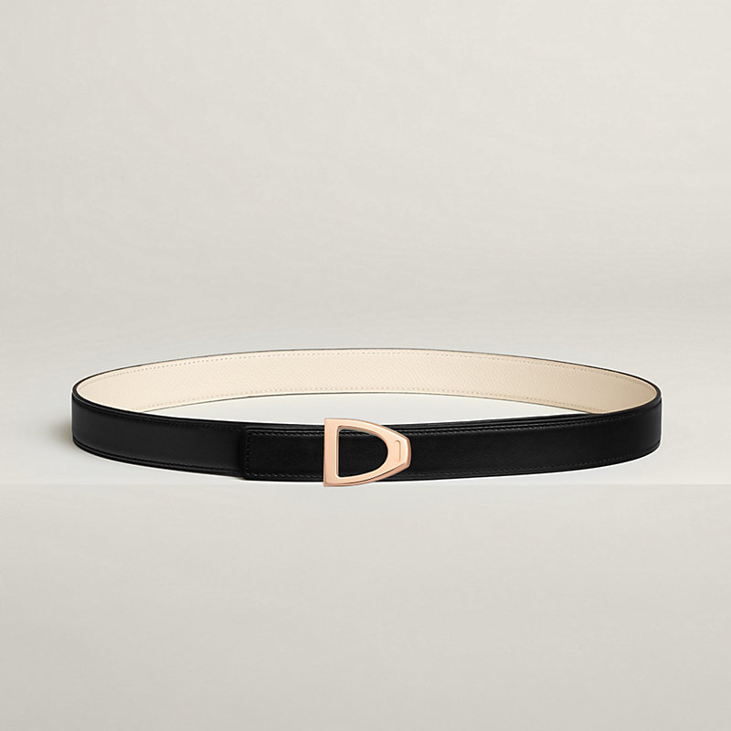 金属皮带扣。这款皮带扣的灵感源自马术世界,呈现爱马仕标志性的马镫造型。边缘镌刻精致的“Hermès”字样。 & Swift和Epsom小牛皮双面皮腰带。