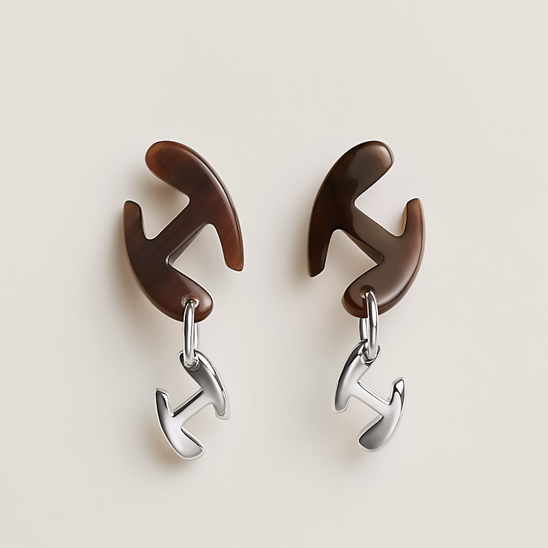 牛角和金属耳环。Chaine d'H系列向爱马仕典藏中的链条致敬,焕新演绎经典珠宝元素——马衔索。“H Nautique”标志经过重新设计,更显时尚。牛角为天然材质,产品颜色和图案或与图片有所差异。