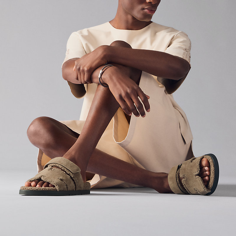 Chypre凉鞋为生活增添轻盈韵律。设计灵感源于阿佛洛狄忒瀑布所在的塞浦路斯岛,传说那里的瀑布能够令青春永驻。这款经典雅致的鞋履搭配柔软耐用的可调节袢带,人体工学橡胶鞋底穿着舒适。“H”型鞋面设计现代而优雅,同时彰显爱马仕精神。