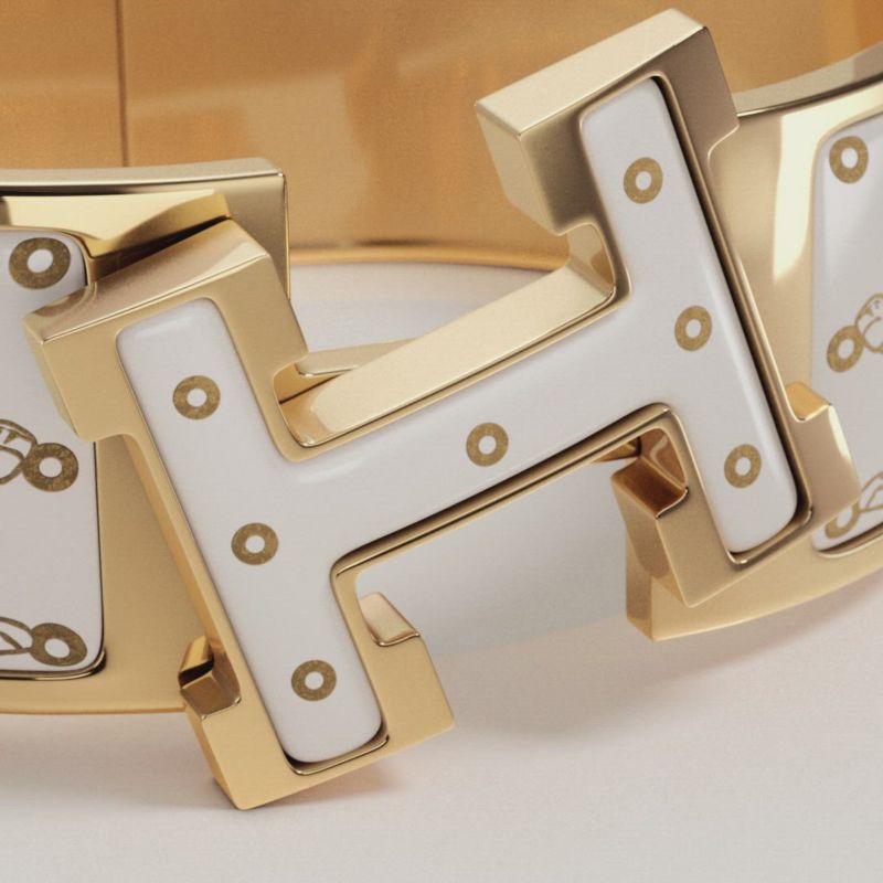 “猎豹”图案印花珐琅宽版手镯,由罗贝尔·达勒(Robert Dallet)设计。这款手镯配有精巧的“H”造型锁扣,开合自如。