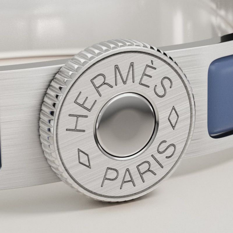 哑光珐琅窄版手镯。这款手镯饰有爱马仕标志性的马鞍钉细节。马鞍钉化身一枚具有巧妙机制的搭扣,其齿冠设计灵感源自腕表的上链表冠。