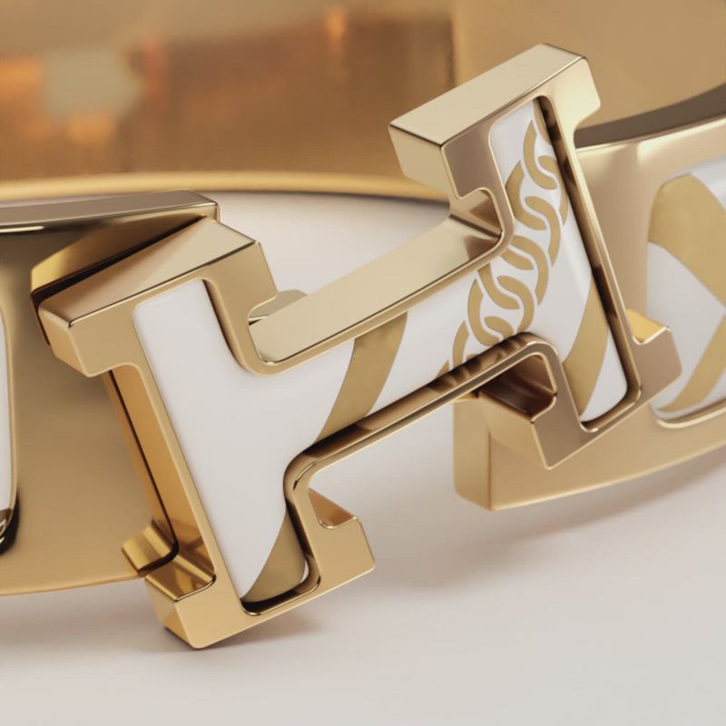 “格子花呢与链条Obliques”图案印花珐琅窄版手镯。这款手镯配有精巧的“H”造型锁扣,开合自如。