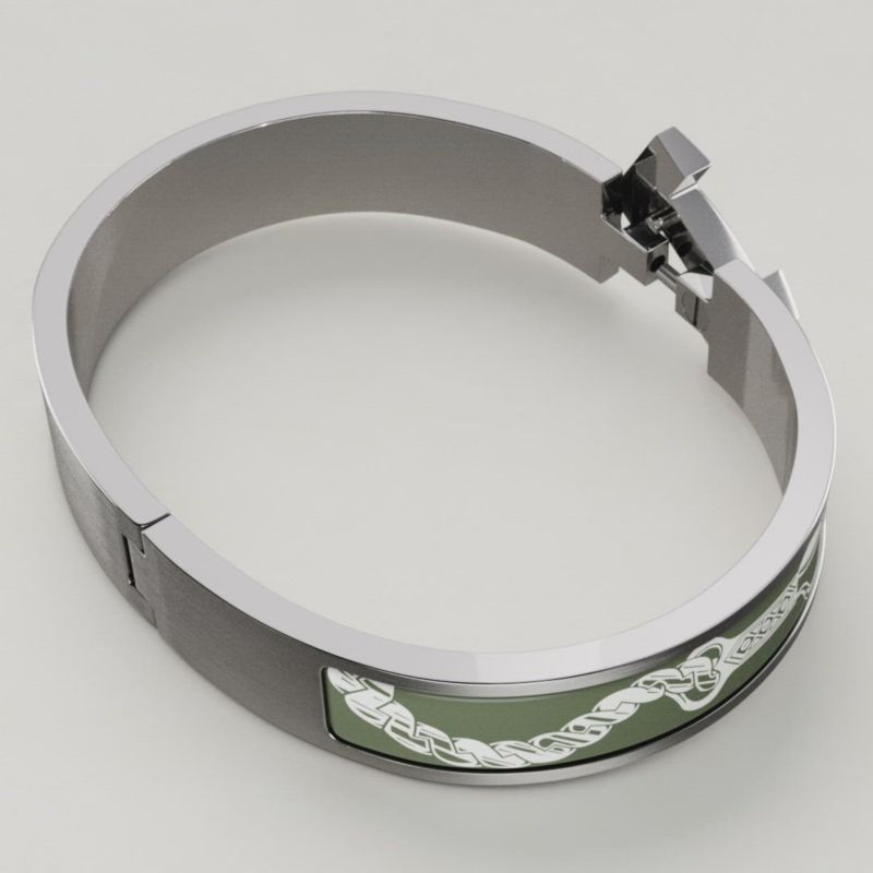 “金属质感爱马仕”图案印花珐琅窄版手镯,由维克多·哈赫曼(Viktor Hachmang)设计。这款手镯配有精巧的“H”造型锁扣,开合自如。