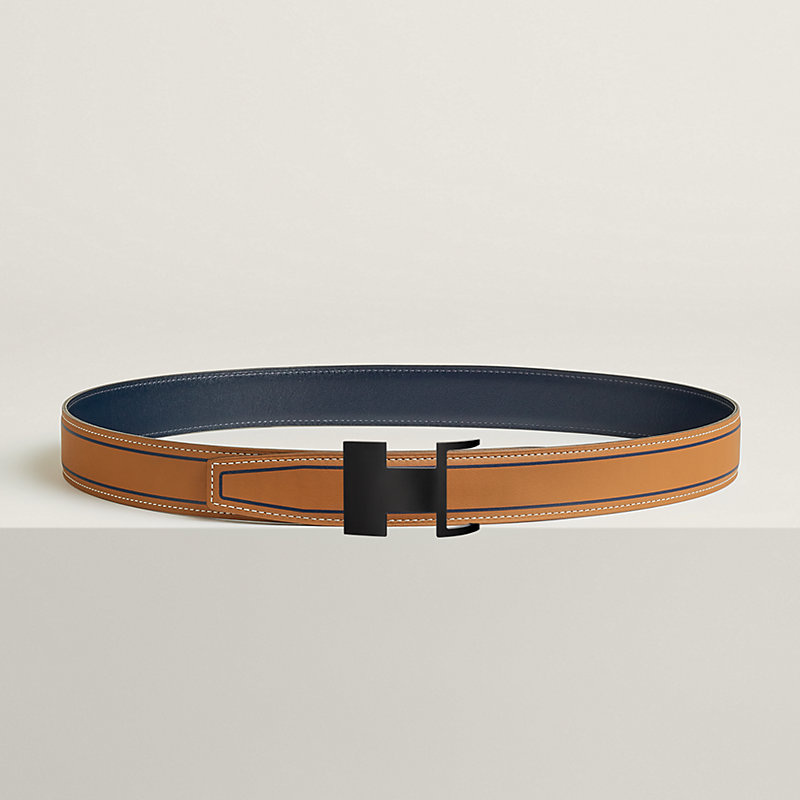 不锈钢皮带扣。Dive 32 So Black皮带扣运用几何设计与隐藏式曲线,巧妙嵌入皮腰带之中。皮革与金属优雅契合,呈现近似“H”字母的不对称造型。金属质感: So Black & 印花Swift和Box 135小牛皮双面皮腰带。Contrast 32皮腰带采用1930年代爱马仕海报上使用的字体,营造出装饰艺术氛围。条纹中央低调地呈现“Hermès Paris”字样。