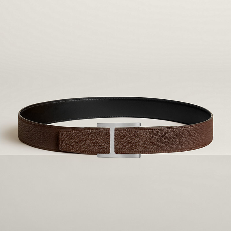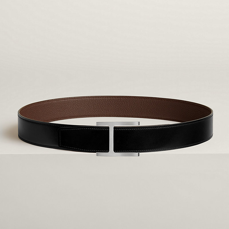 磨砂金属皮带扣。这款皮带扣重新演绎爱马仕经典标志,尽显摩登气息。金属线条与皮革相互交织,演绎两种材质之间的精妙融合。 & Box 135和Togo小牛皮双面皮腰带。