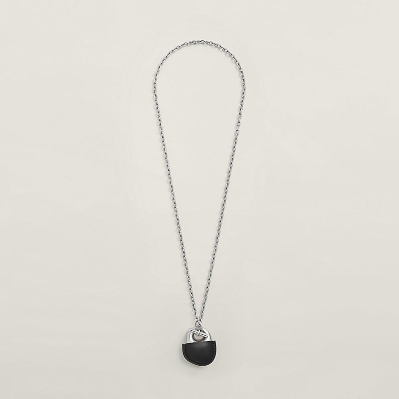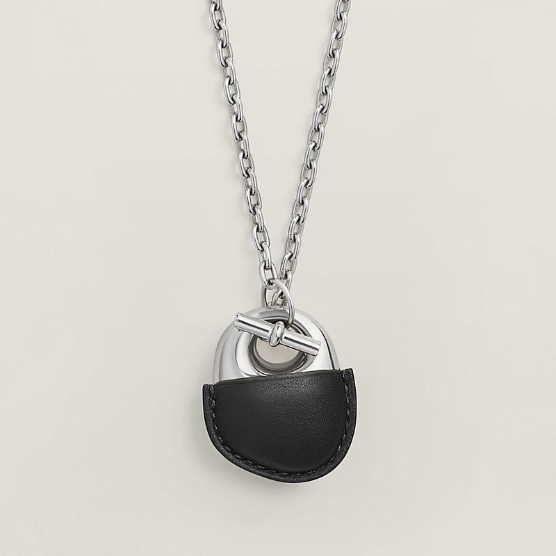 Swift小牛皮和金属项链。这款项链向爱马仕家族传统致意,将来自诺曼底海滩的鹅卵石转变为精美项链。Galet Gaine项链融合金属与皮革工艺:遵循悠久的皮革工艺传统,圆润的有机金属造型包覆手工缝制皮革。