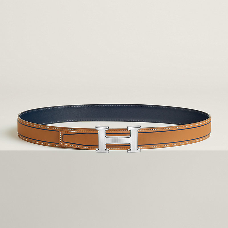 & 印花Swift和Box 135小牛皮双面皮腰带。Contrast 32皮腰带采用1930年代爱马仕海报上使用的字体,营造出装饰艺术氛围。条纹中央低调地呈现“Hermès Paris”字样。