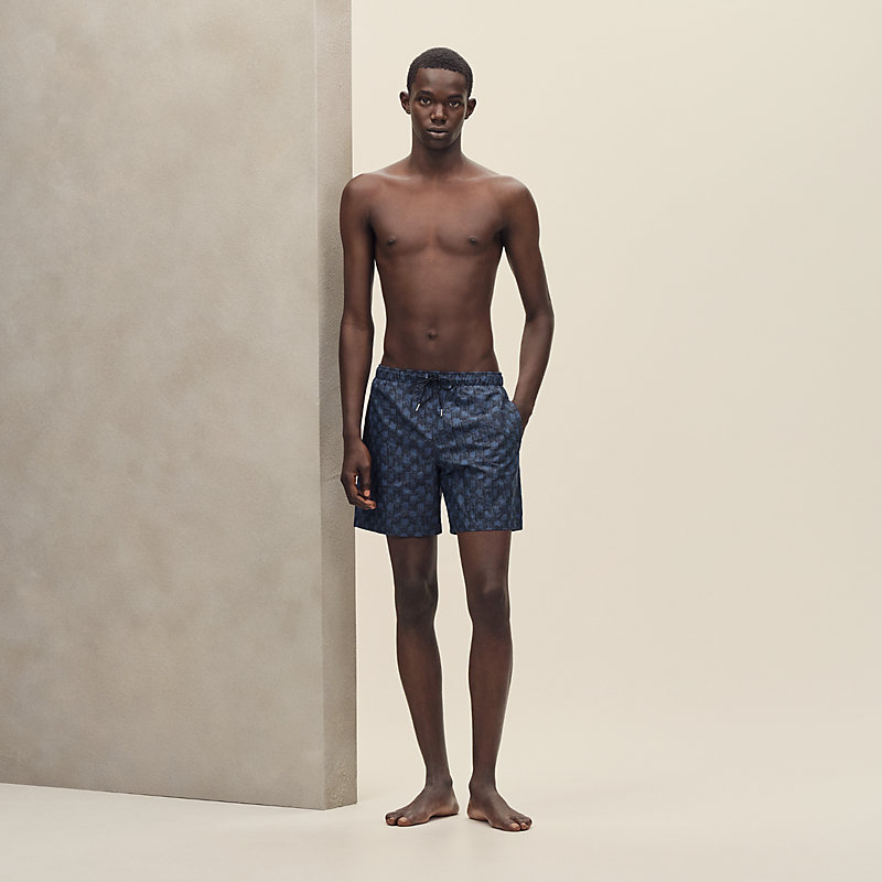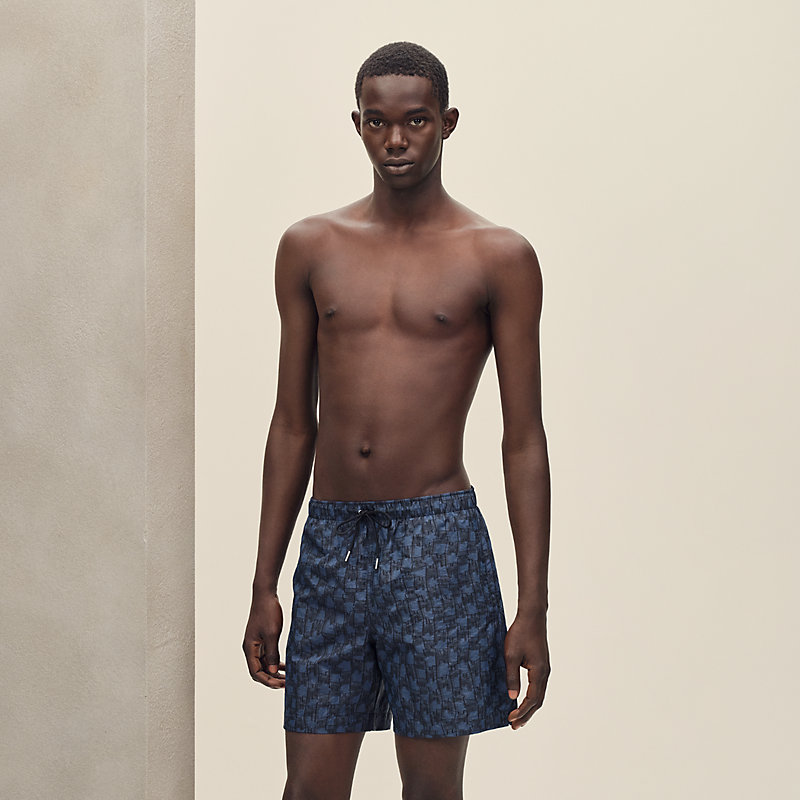 帆布长款短裤,饰有“H Cut Remix”图案印花(100%锦纶)。- 松紧腰头配有抽绳- 侧面口袋- 背面翻盖口袋,配有“Hermès Paris”字样镌刻按扣正常版型,请选择您的常规尺码。