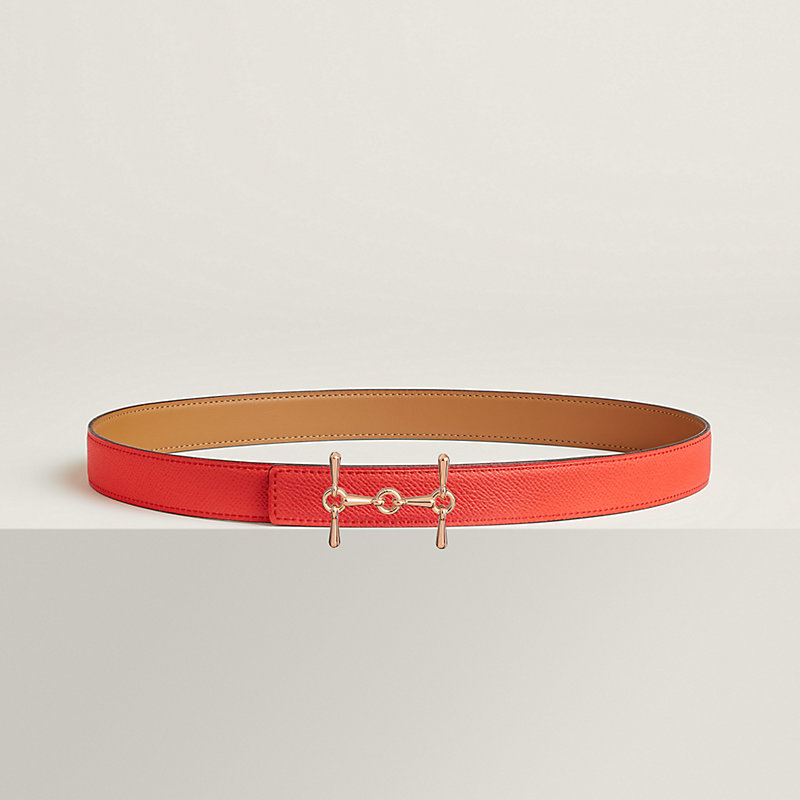 金属皮带扣。这款皮带扣简约大气,灵感源自埃米尔·爱马仕(Émile Hermès)典藏画作中的马衔装置。金属质感: 镀玫瑰金 & Swift和Epsom小牛皮双面皮腰带。