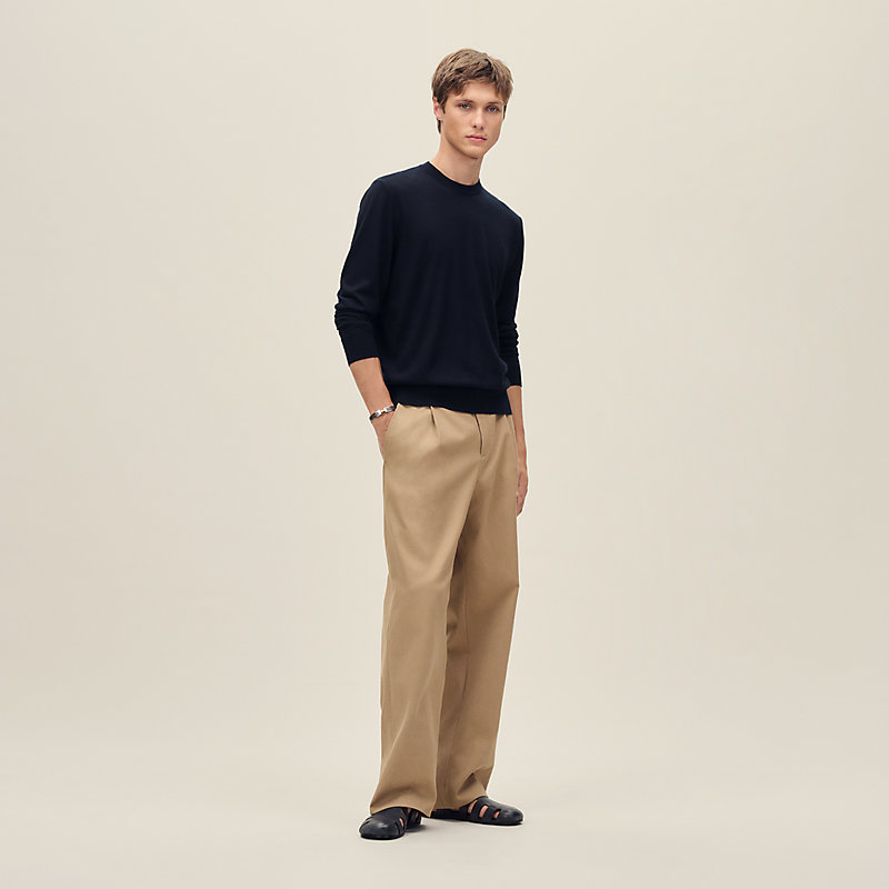 山羊绒和真丝长袖圆领针织衫,饰有“H Etriviere”细节(80%山羊绒,20%桑蚕丝)。- 罗纹滚边衣领、袖口和针织衫底边- 衣袖和袖口饰有撞色嵌花“H Etriviere”图案- 18支单股正常版型,请选择您的常规尺码。