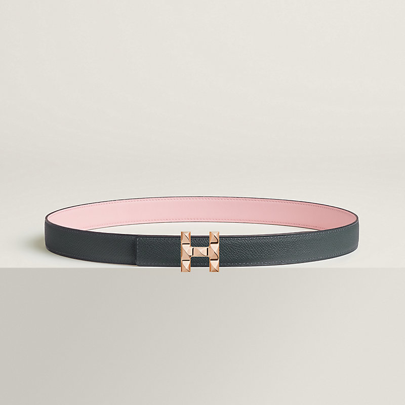 金属皮带扣。Medor铆钉的造型经过变换,构成具有现代感线条的“H”字母。铆钉的刻面相互融合,展现无尽绵延的效果。 & Swift和Epsom小牛皮双面皮腰带。