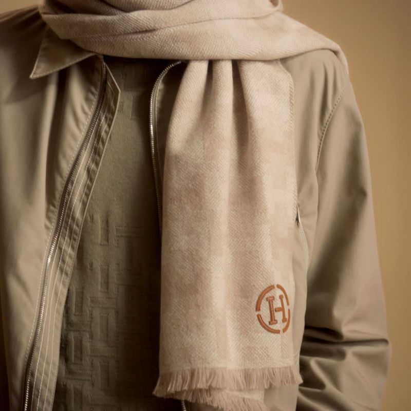 山羊绒围巾(100%山羊绒)。这款柔软围巾采用编织提花的形式展示“H”图案。手感极佳,完全手工制作。