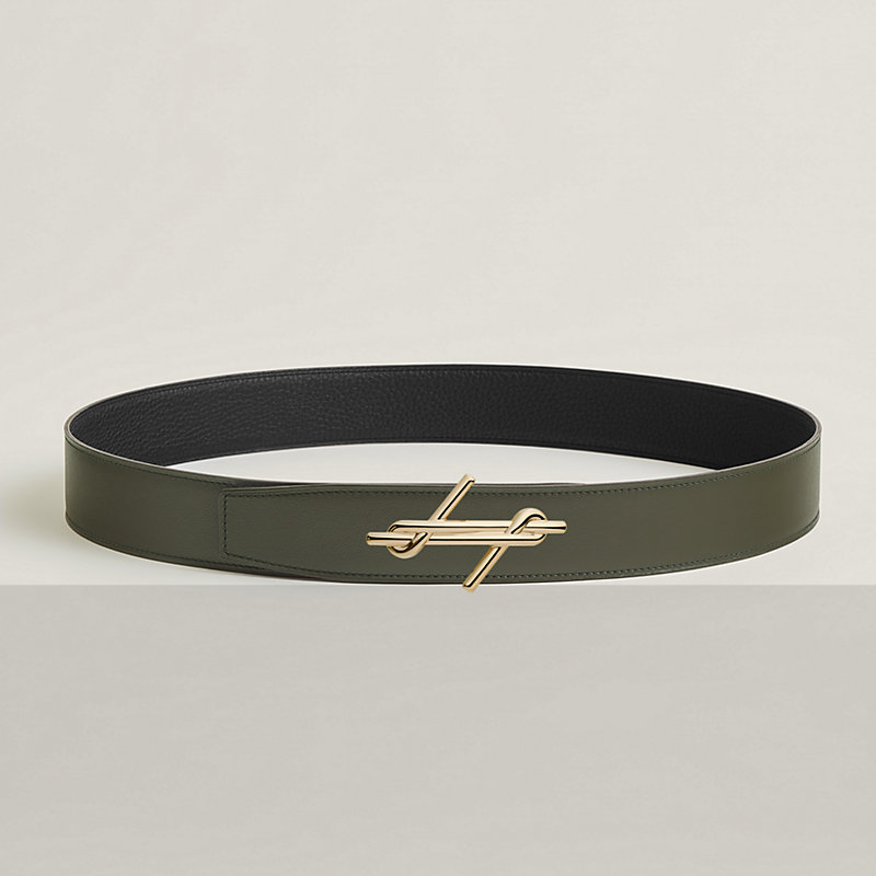 金属皮带扣。这款优雅的皮带扣造型形似水手结,是爱马仕作品的航海风格元素之一。金属质感: 浅金色 & Box 135和Togo小牛皮双面皮腰带。