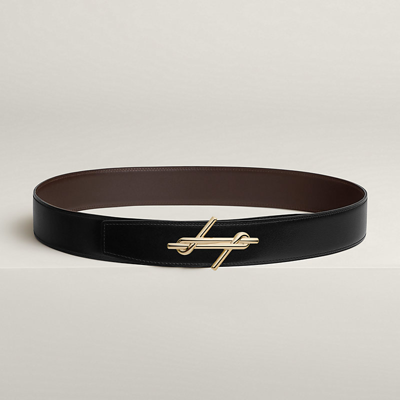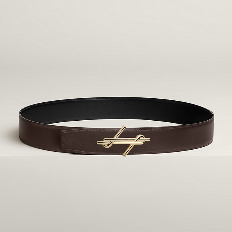 金属皮带扣。这款优雅的皮带扣造型形似水手结,是爱马仕作品的航海风格元素之一。金属质感: 浅金色 & Box 135小牛皮双面皮腰带。