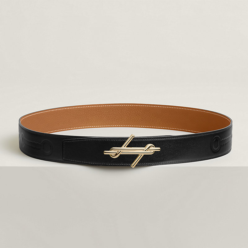 金属皮带扣。这款优雅的皮带扣造型形似水手结,是爱马仕作品的航海风格元素之一。 & 135和Togo小牛皮双面皮腰带,饰有压印“训练”图案,灵感源自同名丝巾。通过高频工艺,将图案优雅而低调地印制于皮腰带。