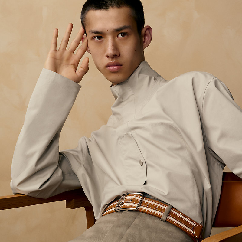 Epsom小牛皮和H帆布双面腰带,搭配金属皮带扣。经典的Half Cod双面皮腰带经过重新设计。纯色一面契合日常穿搭;另一面融合H帆布和皮革,可轻松为夏日海边造型增添风采。