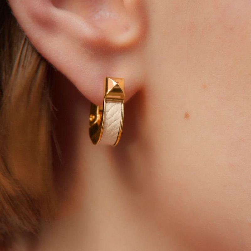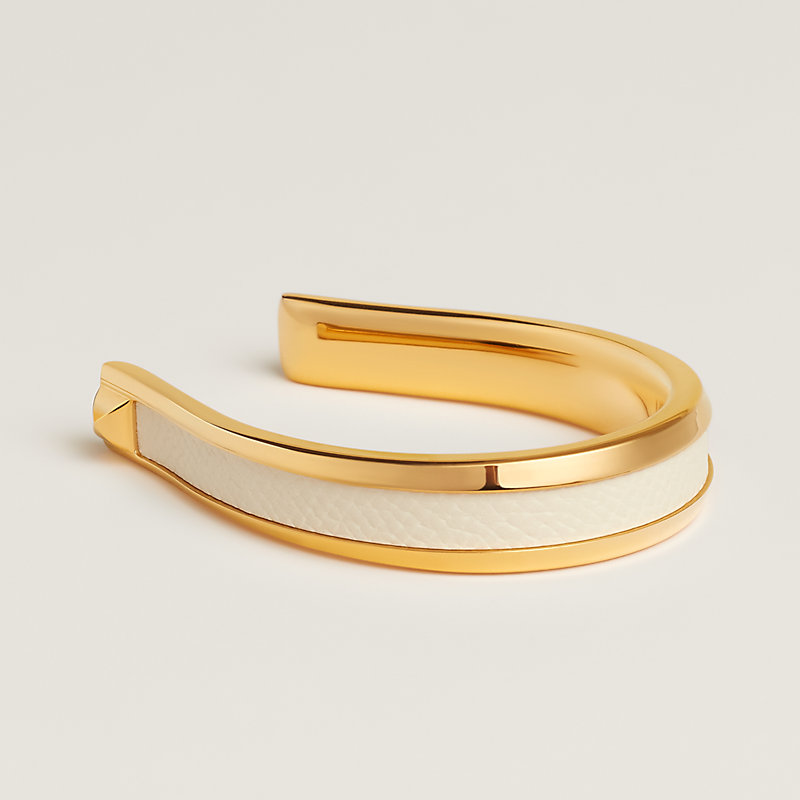 Epsom小牛皮和金属手镯。Jockette系列搭配金属和皮革,重新诠释马术世界的经典元素。马蹄铁以其原本造型和抽象图案呈现于更为精致柔美的设计中。这款手镯展现本季更为大胆的佩戴方式:侧开口手镯。