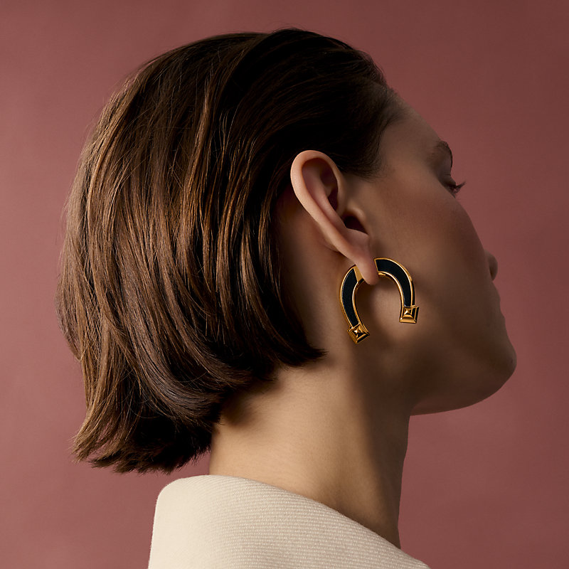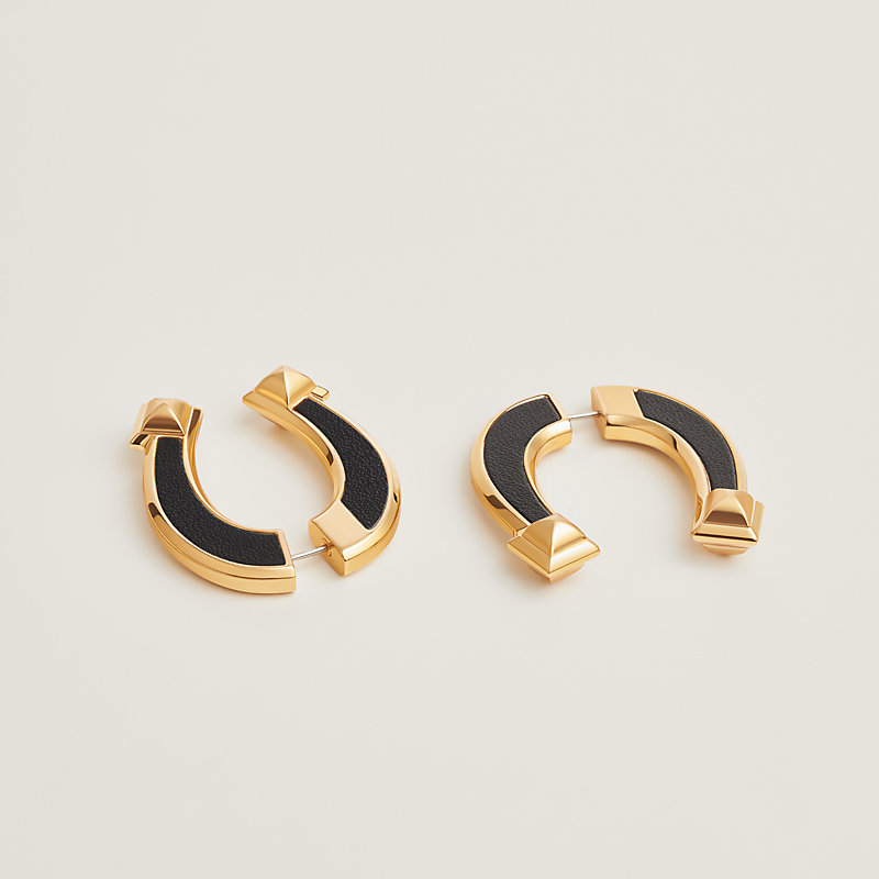 Box小牛皮和金属耳环。Jockette系列搭配金属和皮革,重新诠释马术世界的经典元素。马蹄铁以其原本造型和抽象图案呈现于更为精致柔美的设计中。