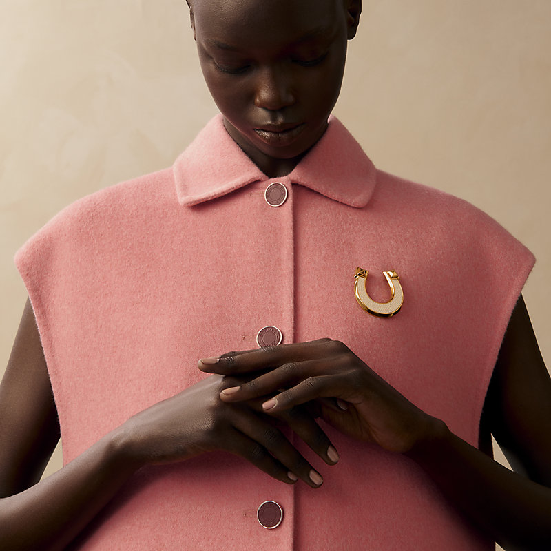 Epsom小牛皮和金属胸针。Jockette系列搭配金属和皮革,重新诠释马术世界的经典元素。马蹄铁以其原本造型和抽象图案呈现于更为精致柔美的设计中。