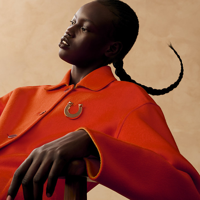 Epsom小牛皮和金属胸针。Jockette系列搭配金属和皮革,重新诠释马术世界的经典元素。马蹄铁以其原本造型和抽象图案呈现于更为精致柔美的设计中。