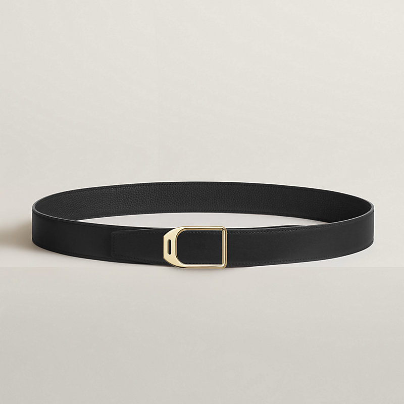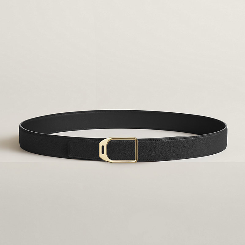金属皮带扣。略呈锥形的皮带扣优雅大方,以现代风格重新演绎马镫,在形状和轮廓之间达成巧妙平衡。 & Chamonix 135和Togo小牛皮双面皮腰带。