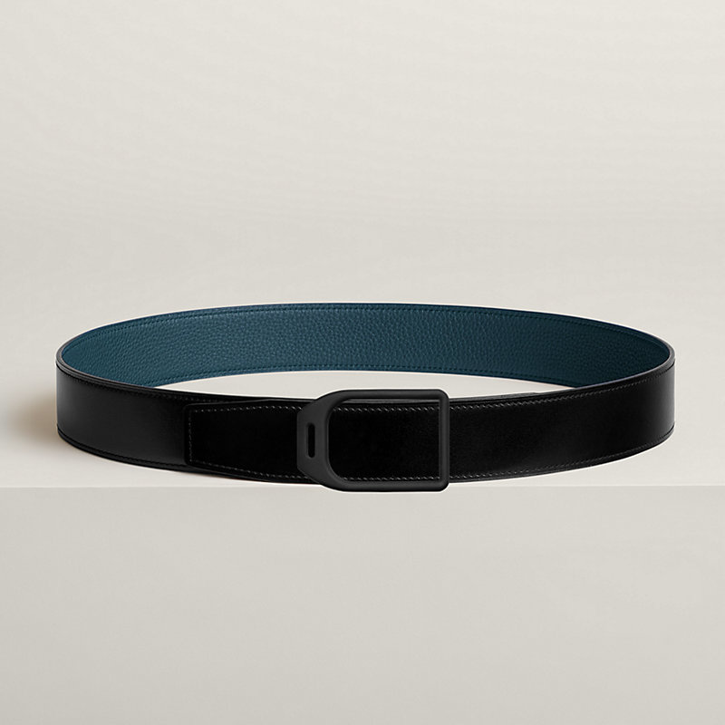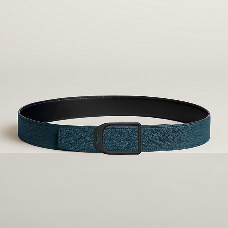 金属皮带扣。略呈锥形的皮带扣优雅大方,以现代风格重新演绎马镫,在形状和轮廓之间达成巧妙平衡。 & Box 135和Togo小牛皮双面皮腰带。