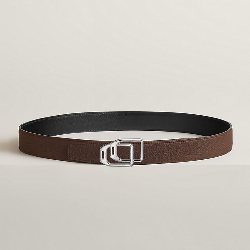 金属皮带扣。两枚Jockey表带扣巧妙化为相互交织的马镫图案,营造出优雅而富有趣味的错视效果设计:Jockey au Carre。 & Box 135和Togo小牛皮双面皮腰带。
