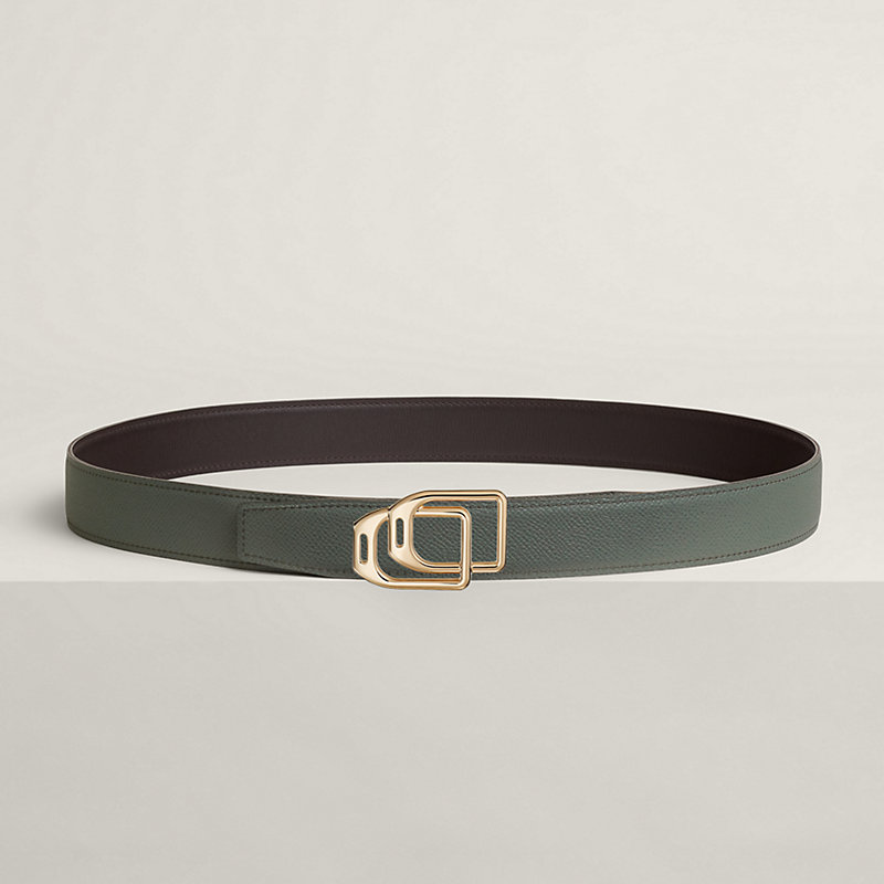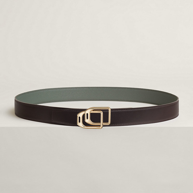 金属皮带扣。两枚Jockey表带扣巧妙化为相互交织的马镫图案,营造出优雅而富有趣味的错视效果设计:Jockey au Carre。金属质感: 浅金色 & Odyssee和Epsom小牛皮双面皮腰带。