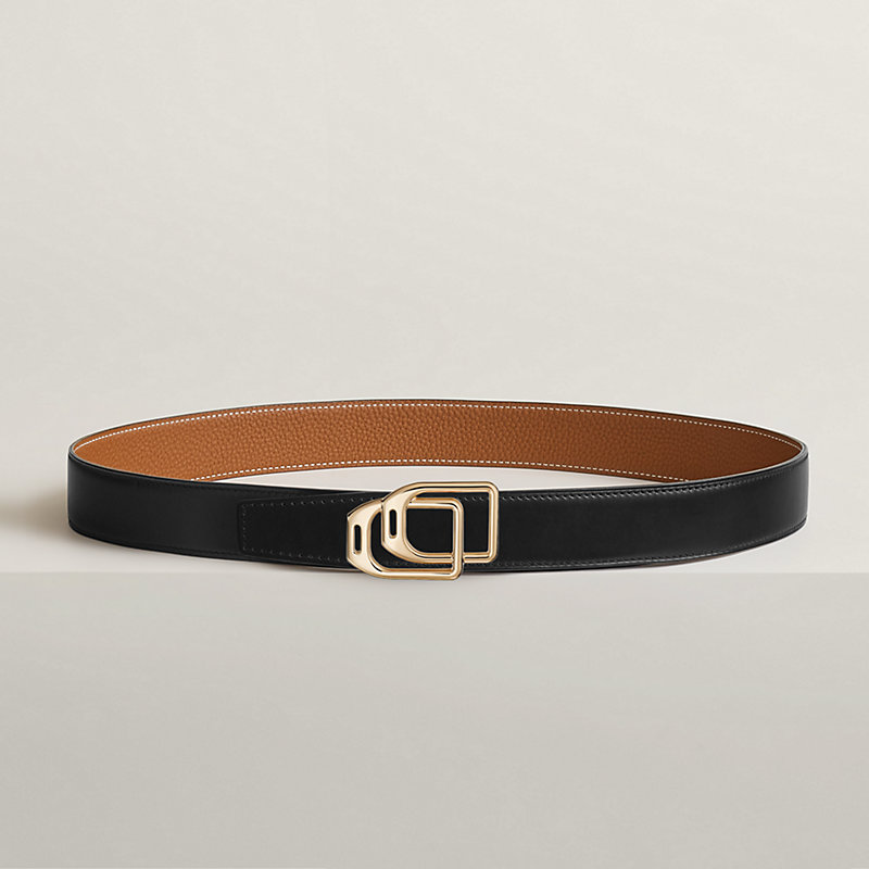 金属皮带扣。两枚Jockey表带扣巧妙化为相互交织的马镫图案,营造出优雅而富有趣味的错视效果设计:Jockey au Carre。 & Box 135和Togo小牛皮双面皮腰带。