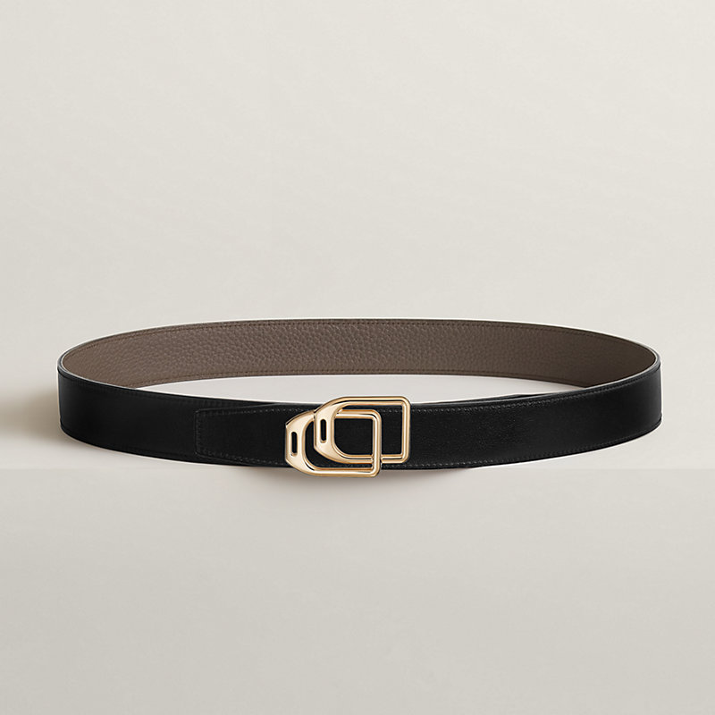金属皮带扣。两枚Jockey表带扣巧妙化为相互交织的马镫图案,营造出优雅而富有趣味的错视效果设计:Jockey au Carre。 & Box 135和Togo小牛皮双面皮腰带。