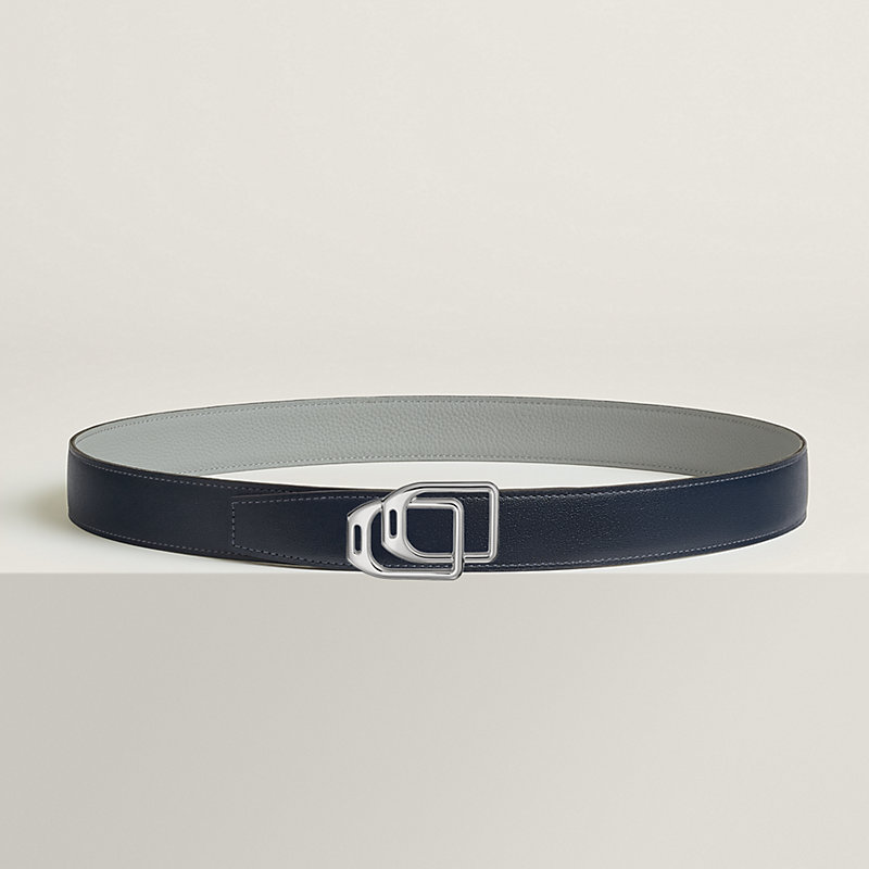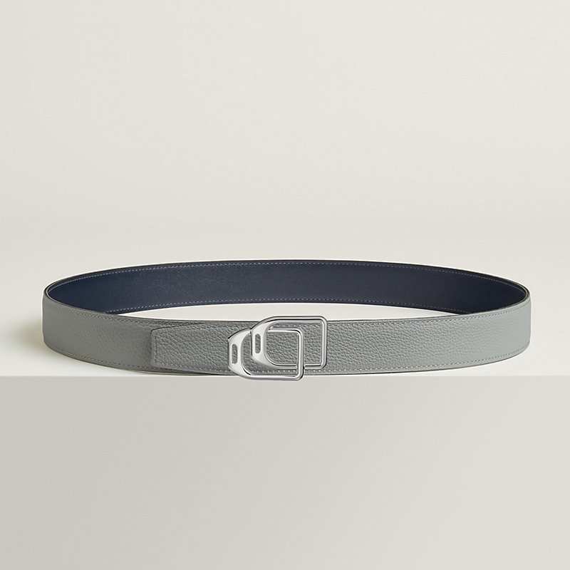 金属皮带扣。两枚Jockey表带扣巧妙化为相互交织的马镫图案,营造出优雅而富有趣味的错视效果设计:Jockey au Carre。 & Box 135和Togo小牛皮双面皮腰带。