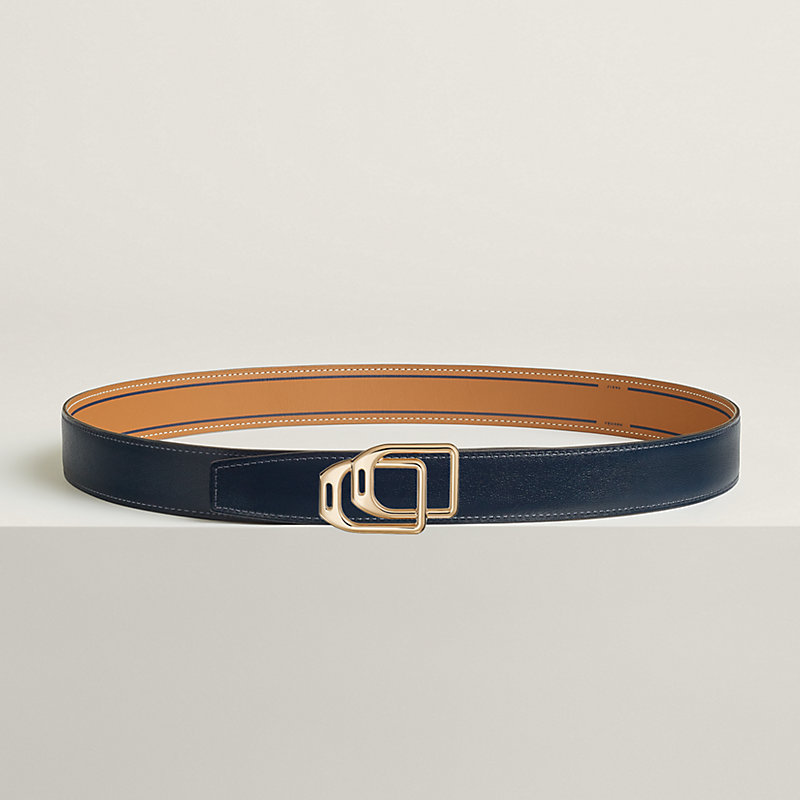 & 印花Swift和Box 135小牛皮双面皮腰带。Contrast 32皮腰带采用1930年代爱马仕海报上使用的字体,营造出装饰艺术氛围。条纹中央低调地呈现“Hermès Paris”字样。