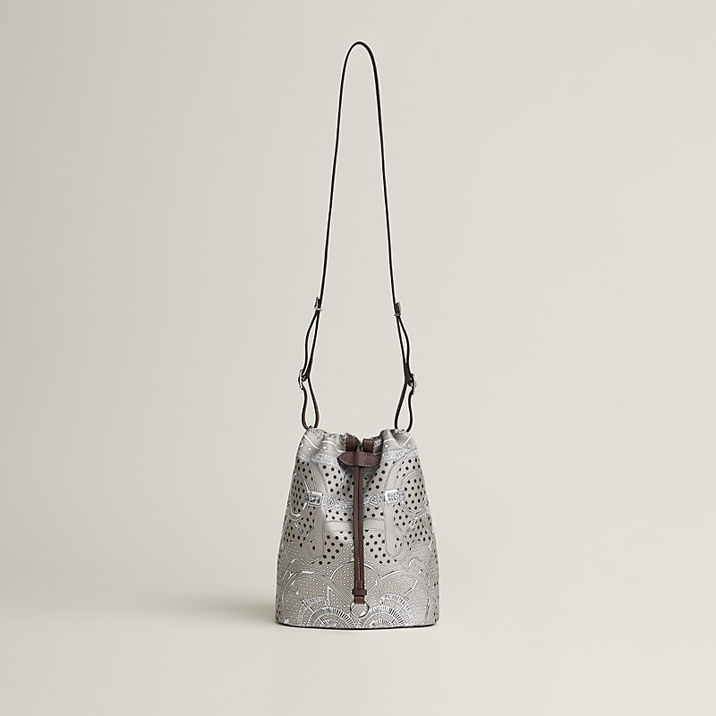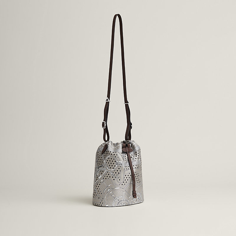这款精巧包袋融合真丝与皮革材质,展现爱马仕插画师亨利·道西尼(Henri d'Origny)标志性的“金质马刺方巾”(Eperon d'Or Bandana)设计。此款水桶包轻便灵活,是夏日必备之选,由品牌鞍具皮革工匠和金匠精心制作。硬实底部、皮革绳带和圆环锁扣,以及可调节可拆卸肩带上的金属搭扣,打造无拘无束的斜挎体验。尺寸恰到好处,可容纳您的日常物品。
