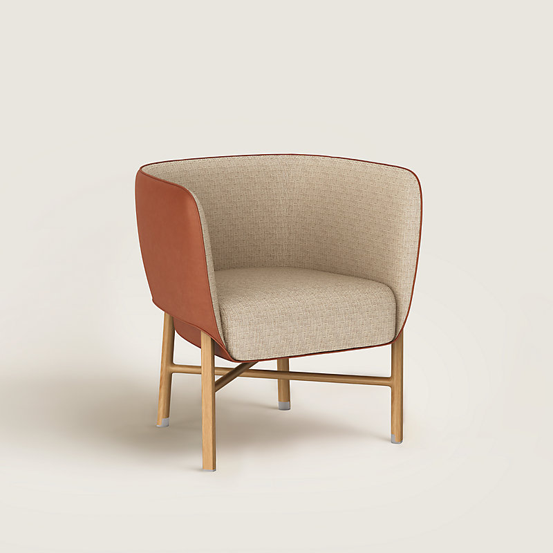 扶手椅,实木橡木椅腿搭配磨砂不锈钢椅脚。椅身包覆H小公牛皮。软垫椅座和椅背包覆H小公牛皮和“Cravache”印花面料。