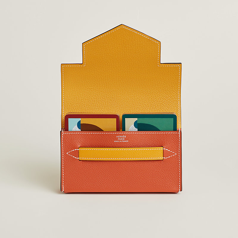 Lord Pocket卡牌收纳包的灵感源自爱马仕1940年代典藏作品中的一款卡包,推出双色款式。色彩鲜明的设计采用小巧尺寸,适合扑克和桥牌两种纸牌游戏。正面翻盖开合,适合随身携带。旅行收纳包采用Evercolor小牛皮和Chagrin山羊皮制作,备有三种颜色款式(中绿色、焦糖色和红土色),饰以标志性马鞍针法缝线。内含任通设计的“编织骏马”纸牌游戏。