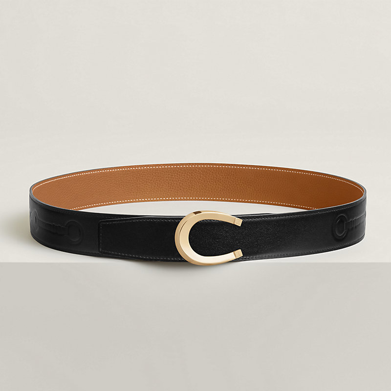 金属皮带扣。这款马蹄铁造型皮带扣彰显爱马仕的马术传统,为佩戴者带来无限好运。 & 135和Togo小牛皮双面皮腰带,饰有压印“训练”图案,灵感源自同名丝巾。通过高频工艺,将图案优雅而低调地印制于皮腰带。