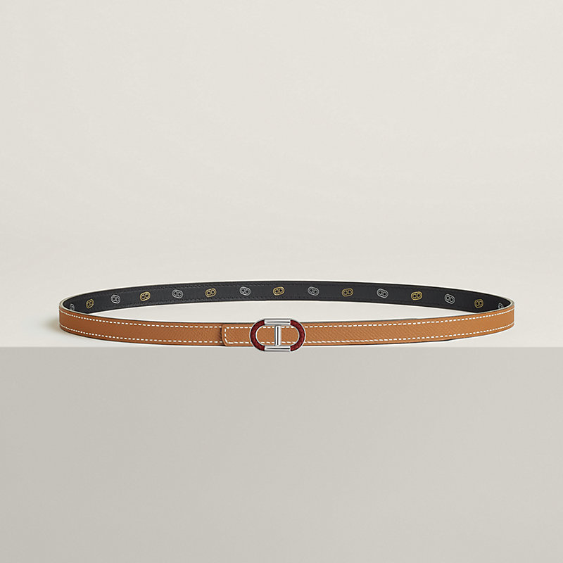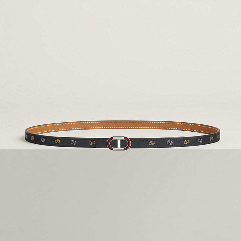 Swift小牛皮和金属皮带扣。这款皮带扣饰有精美的编织元素,展现标志性“H”字母和链环造型。 & 印花Swift和Epsom小牛皮双面皮腰带。爱马仕经典Chaine d'Ancre设计元素以沿皮腰带烫印的金箔呈现,线条精致细腻。