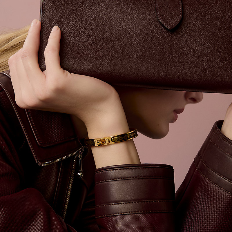 1、2、3……咔哒 如同一场逆向创作,三步完美呈现爱马仕手镯。1、将手镯灵巧滑向腕间。2、轻合搭扣。3、旋转搭扣。咔哒,创作完成!
