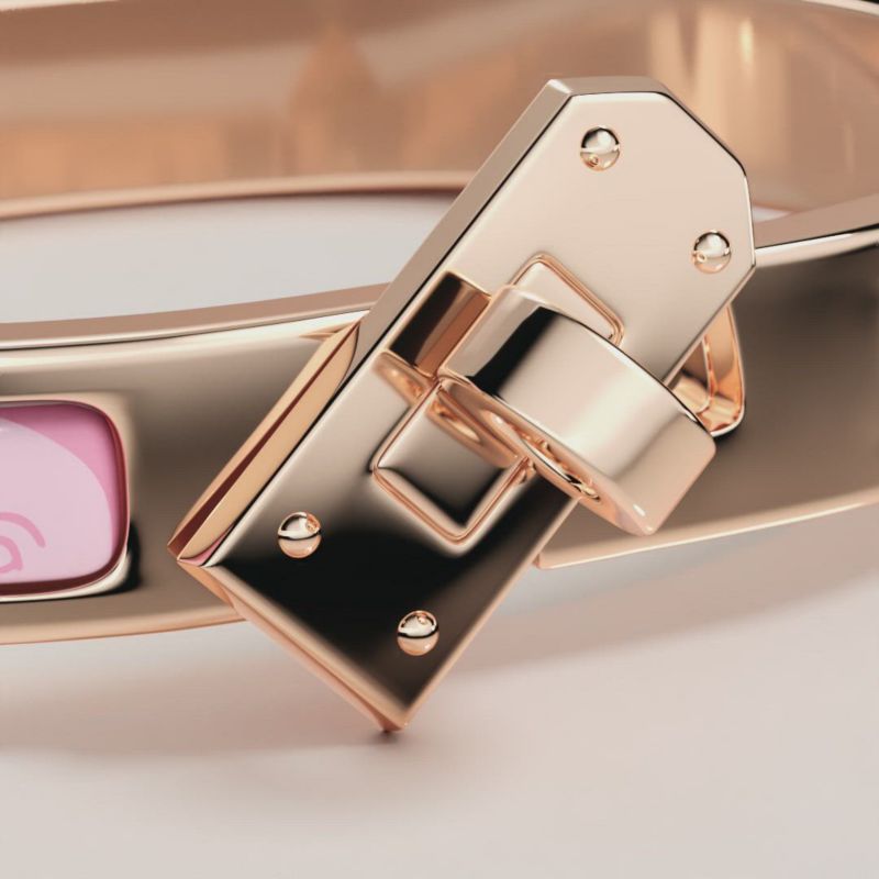 1、2、3……咔哒 如同一场逆向创作,三步完美呈现爱马仕手镯。1、将手镯灵巧滑向腕间。2、轻合搭扣。3、旋转搭扣。咔哒,创作完成!